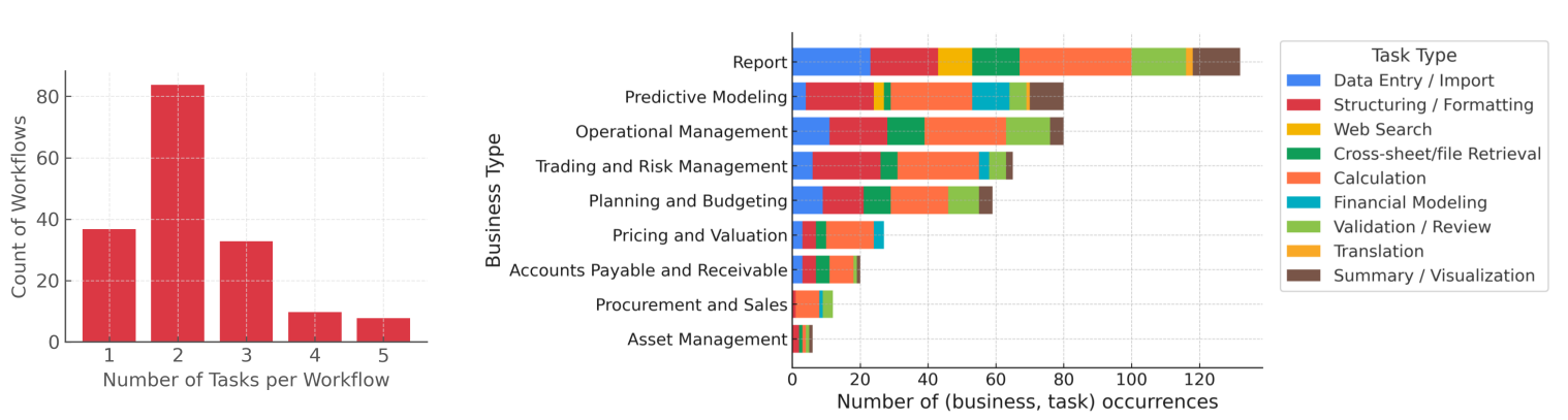 This process yields 172 enterprise-grade workflowsโprimarily multi-task composite workflows, involving 1,710 spreadsheets and 27 million cells, capturing the intrinsic messy, long-horizon, knowledge-intensive, and collaborative nature of real-world finance & accounting work. 92.4% of workflows involve multiple input and reference sheets, with an average of 8 sheets and a long tail reaching 91 spreadsheets. In this release, we provide full annotations for the 172 workflows and the evaluation code.