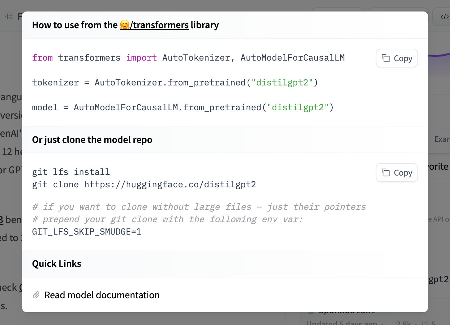 If a model on the Hub is tied to a supported library, loading the model can be done in just a few lines. For information on accessing the model, you can click on the “Use in Library” button on the model page to see how to do so. For example, distilbert/distilgpt2 shows how to do so with 🤗 Transformers below.