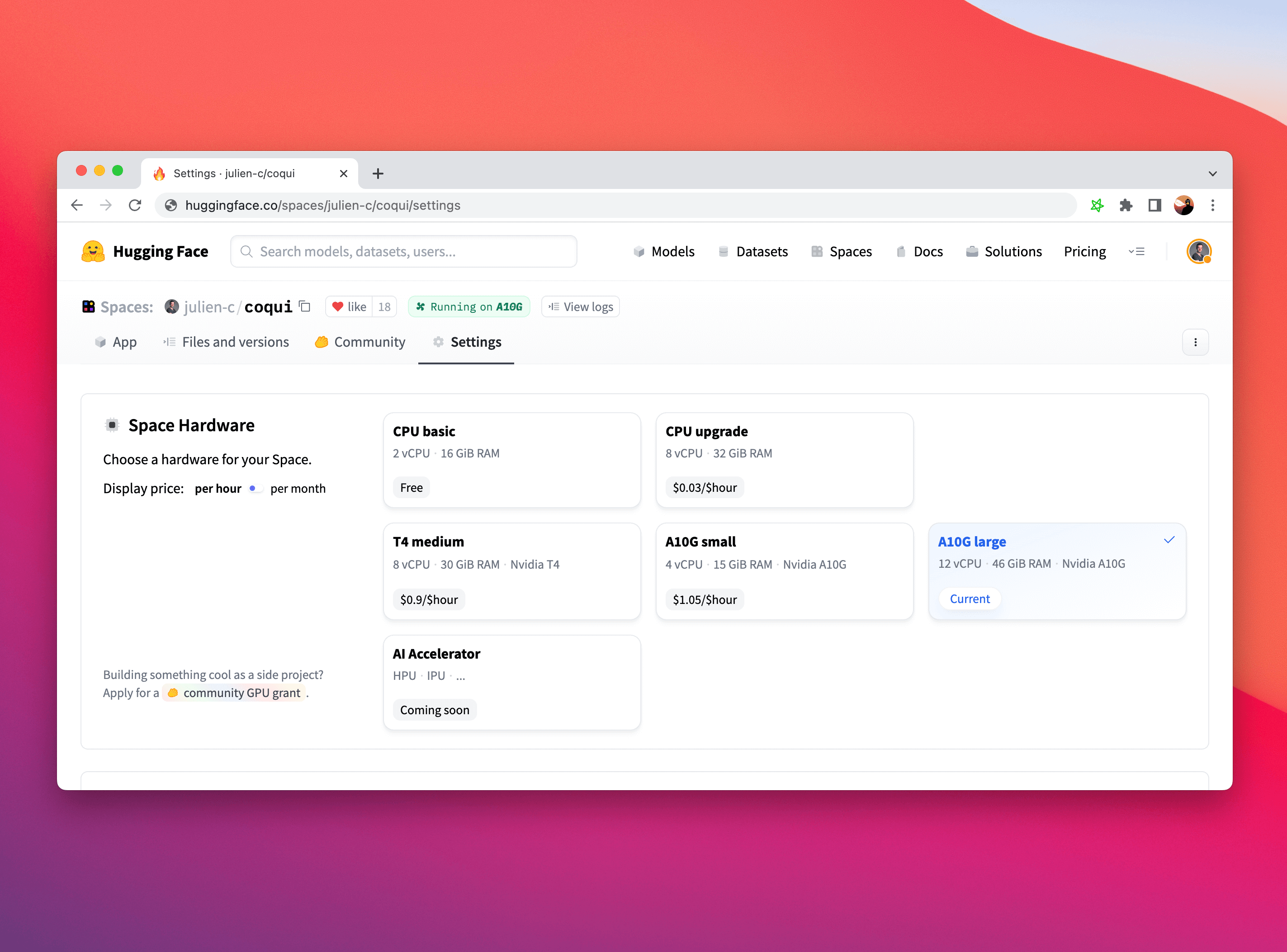 Longer-term, we would also like to expose non-GPU hardware, like HPU, IPU or TPU. If you have a specific AI hardware you’d like to run on, please let us know (website at huggingface.co).