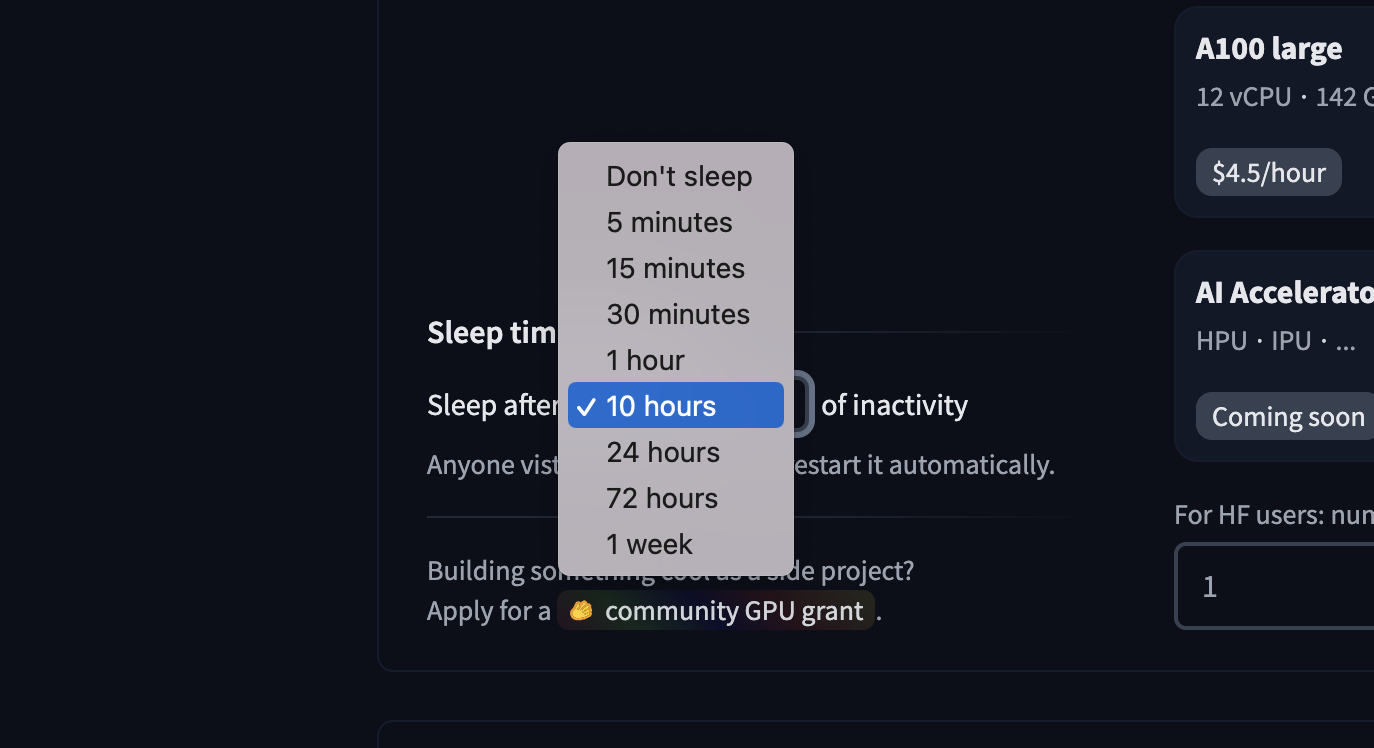 Do you have an awesome Space but need help covering the GPU hardware upgrade costs? We love helping out those with an innovative Space so please feel free to apply for a community GPU grant and see if yours makes the cut! This application can be found in your Space hardware repo settings in the lower left corner under “sleep time settings”: