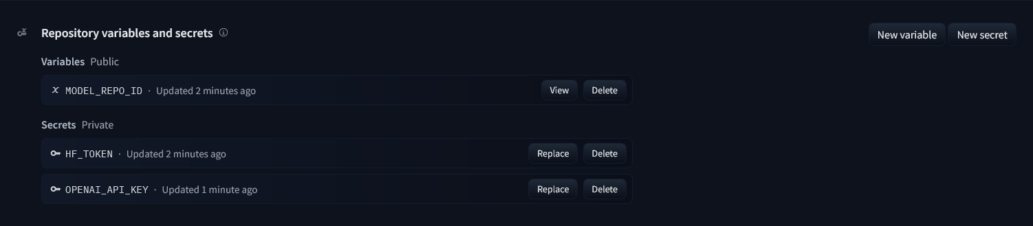 If your app requires environment variables (for instance, secret keys or tokens), do not hard-code them inside your app! Instead, go to the Settings page of your Space repository and add a new variable or secret. Use variables if you need to store non-sensitive configuration values and secrets for storing access tokens, API keys, or any sensitive value or credentials.