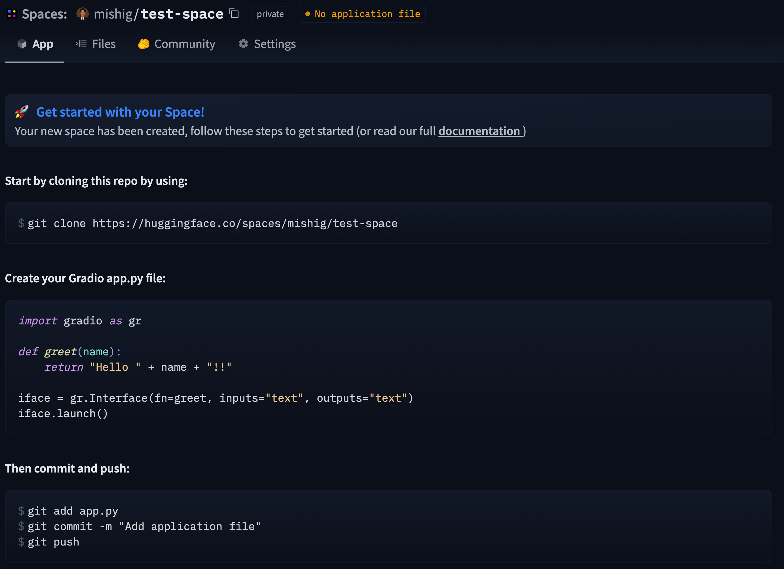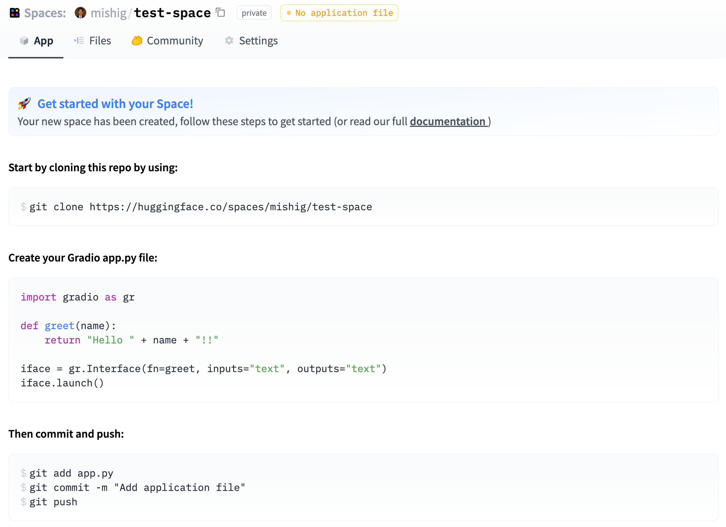In the following sections, you’ll learn the basics of creating a Space, configuring it, and deploying your code to it.
