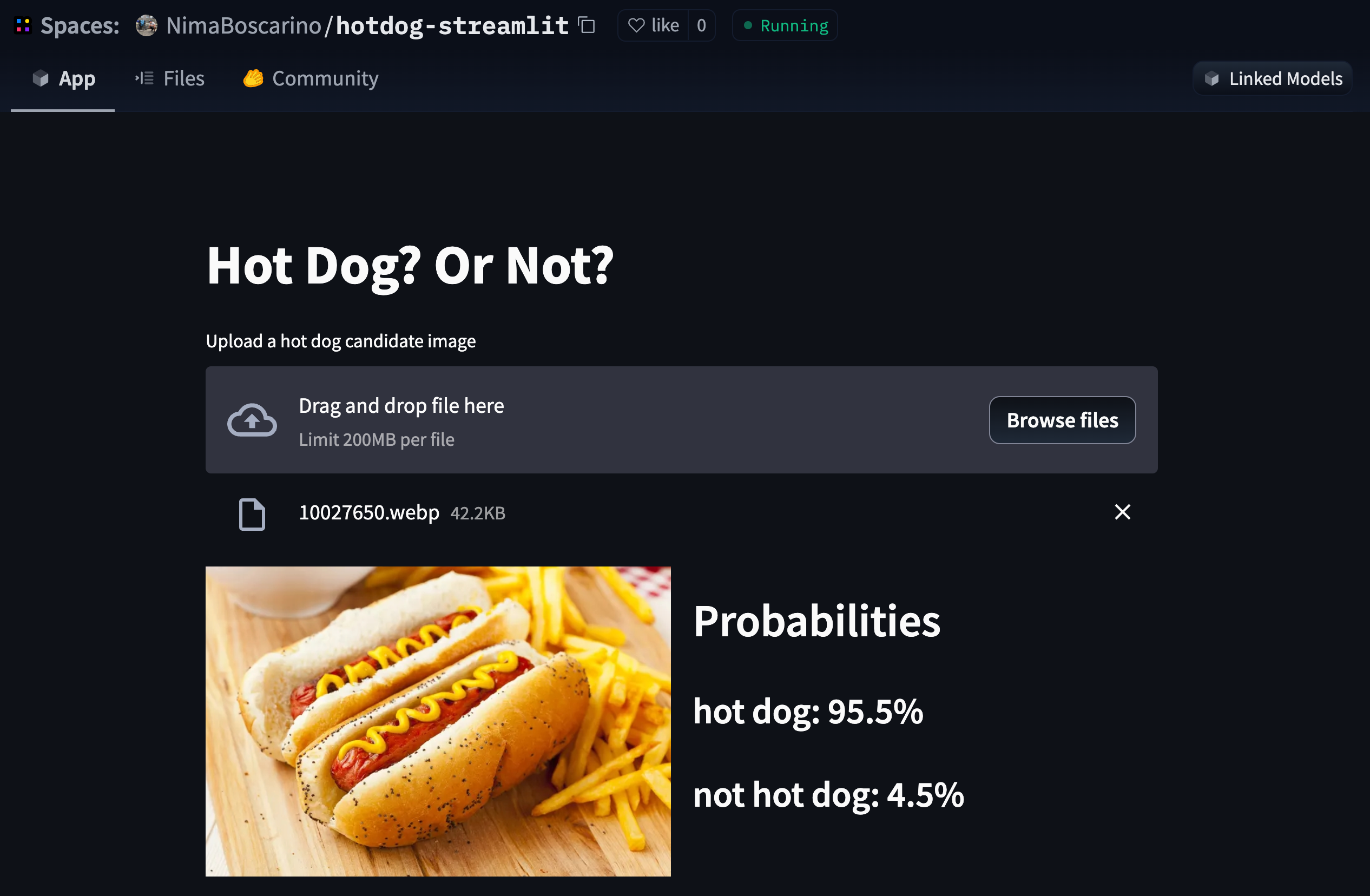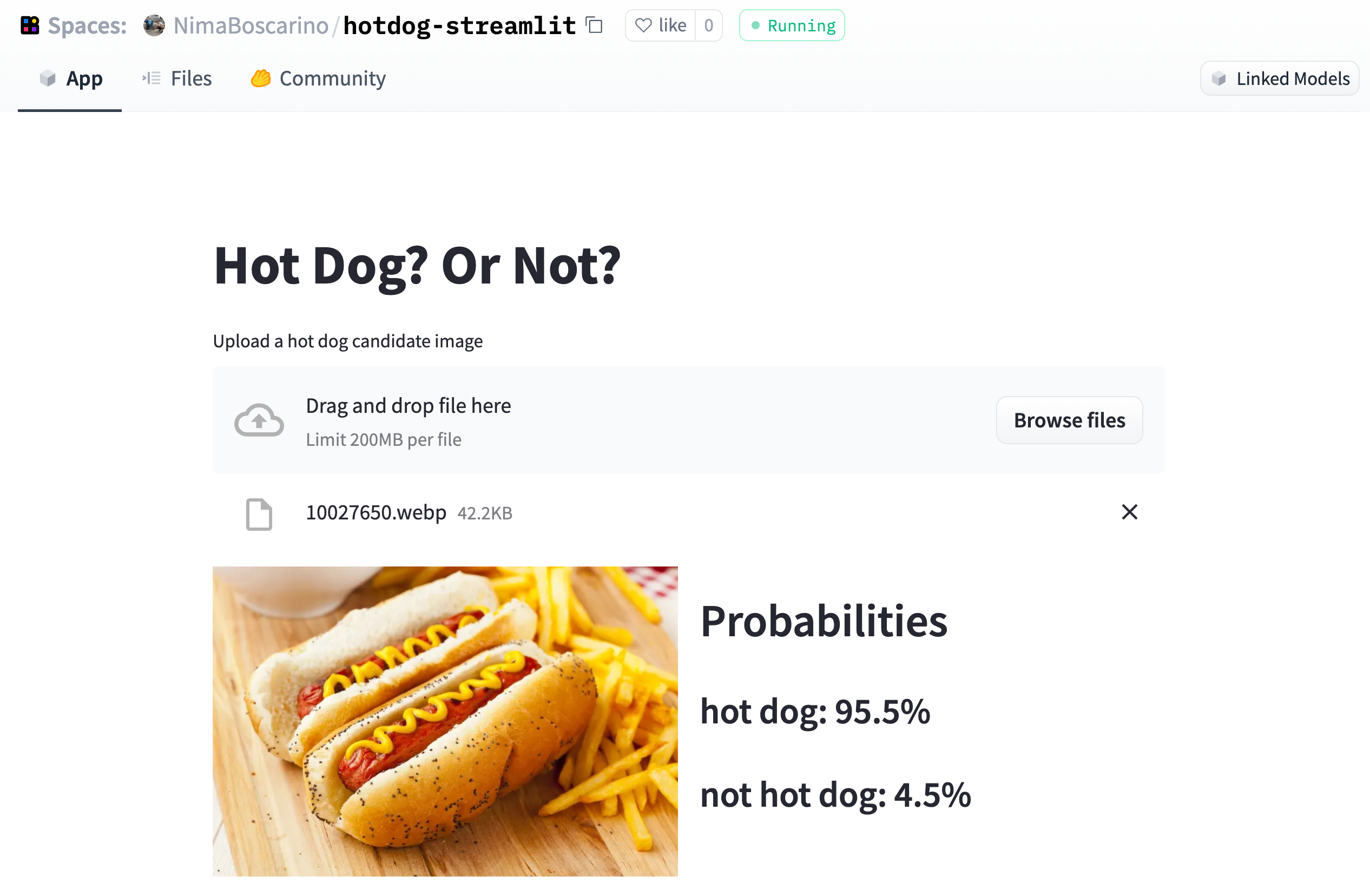 col2.subheader(f"{ p['label'] }: { round(p['score'] * 100, 1)}%")This Python script uses a 🤗 Transformers pipeline to load the julien-c/hotdog-not-hotdog model, which is used by the Streamlit interface. The Streamlit app will expect you to upload an image, which it’ll then classify as hot dog or not hot dog. Once you’ve saved the code to the app.py file, visit the App tab to see your app in action!