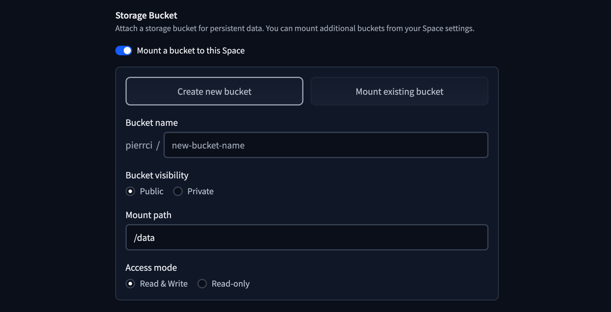 Buckets can be attached when creating a Space, from the Space settings UI, or programmatically via the huggingface_hub Python API. They can be mounted read-write (the default) or read-only.