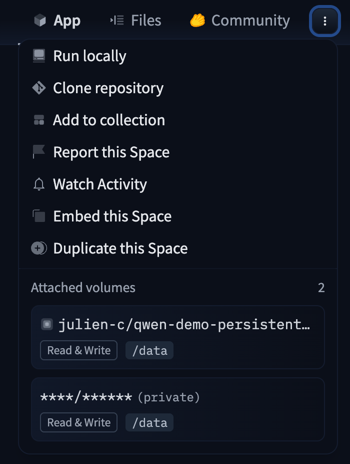 Once attached, repo volumes appear in the Space actions dropdown alongside buckets and can be viewed or unmounted from the UI.