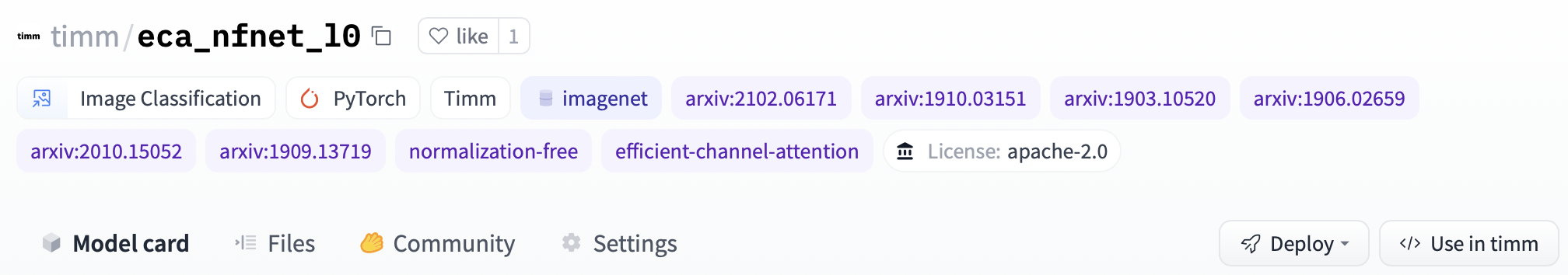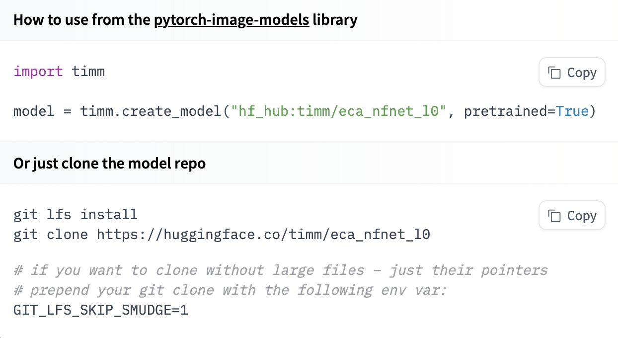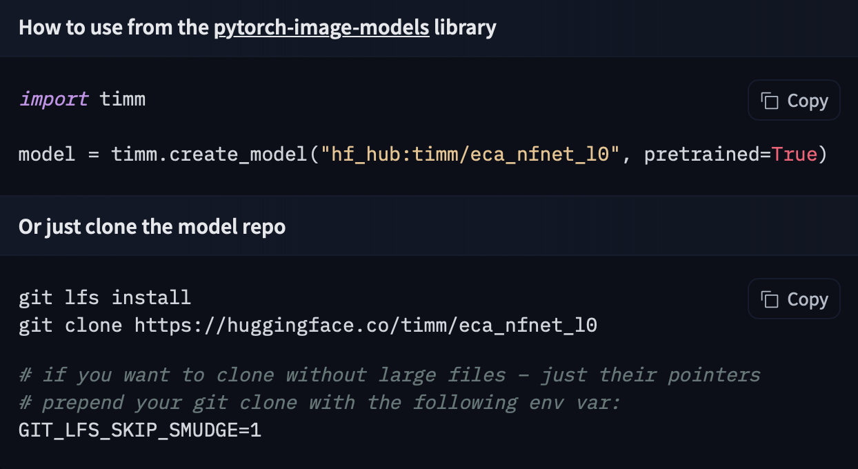 model = timm.create_model("hf-hub:timm/eca_nfnet_l0", pretrained=True)If you want to see how to load a specific model, you can click Use in timm and you will be given a working snippet to load it!