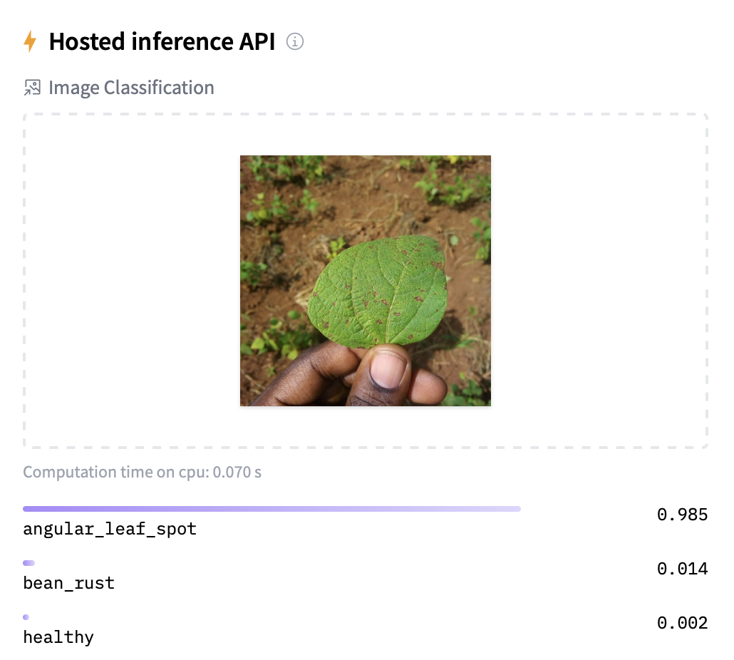 # [{"label":"angular_leaf_spot","score":0.9845947027206421},{"label":"bean_rust","score":0.01368315052241087},{"label":"healthy","score":0.001722085871733725}]Additional resources