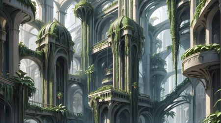- atrium with hanging plants in a dystopian,Ephemeral fantasy megacity edge of time, masterpiece, by Vitaly Bulgarov