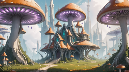 - elvish architecture, scifi, noon, scenery, in a Lonely Hallucinogenic Mushroom Field