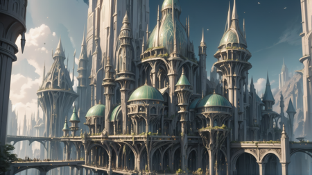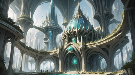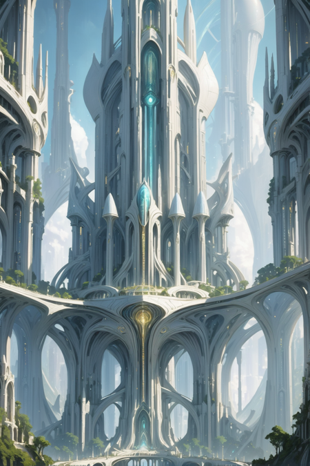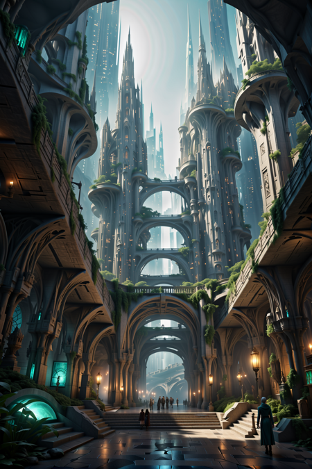 - elvish architecture, steampunk, scifi, Empyrean,solemn fantasy megacity at the beginning of reality