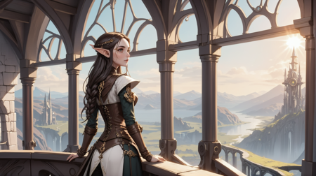 - elvish architecture, steampunk, elf, slim, 1girl, woman, beautiful, natural sunlight, interior, in a barren scenic overlook